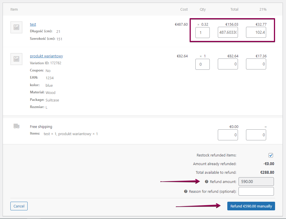 Pod kwotą netto i kwotą VAT produktów pojawią się pola edycji, w których można wprowadzić kwoty zwrotu. Obie kwoty należy wprowadzić ręcznie, co oznacza, że w przypadku częściowych zwrotów za produkt, kwotę zwrotu VAT należy obliczyć na podstawie kwoty netto.