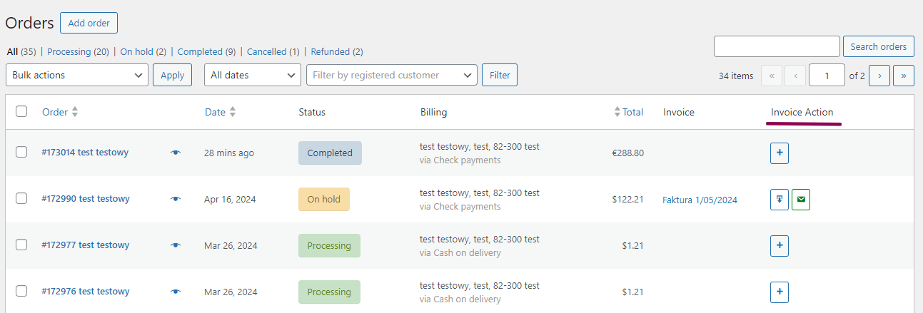 You may also want to issue documents for WooCommerce orders manually. This can be done by additional Buttons on the WooCommerce -> Orders -> Invoice Action buttons.
