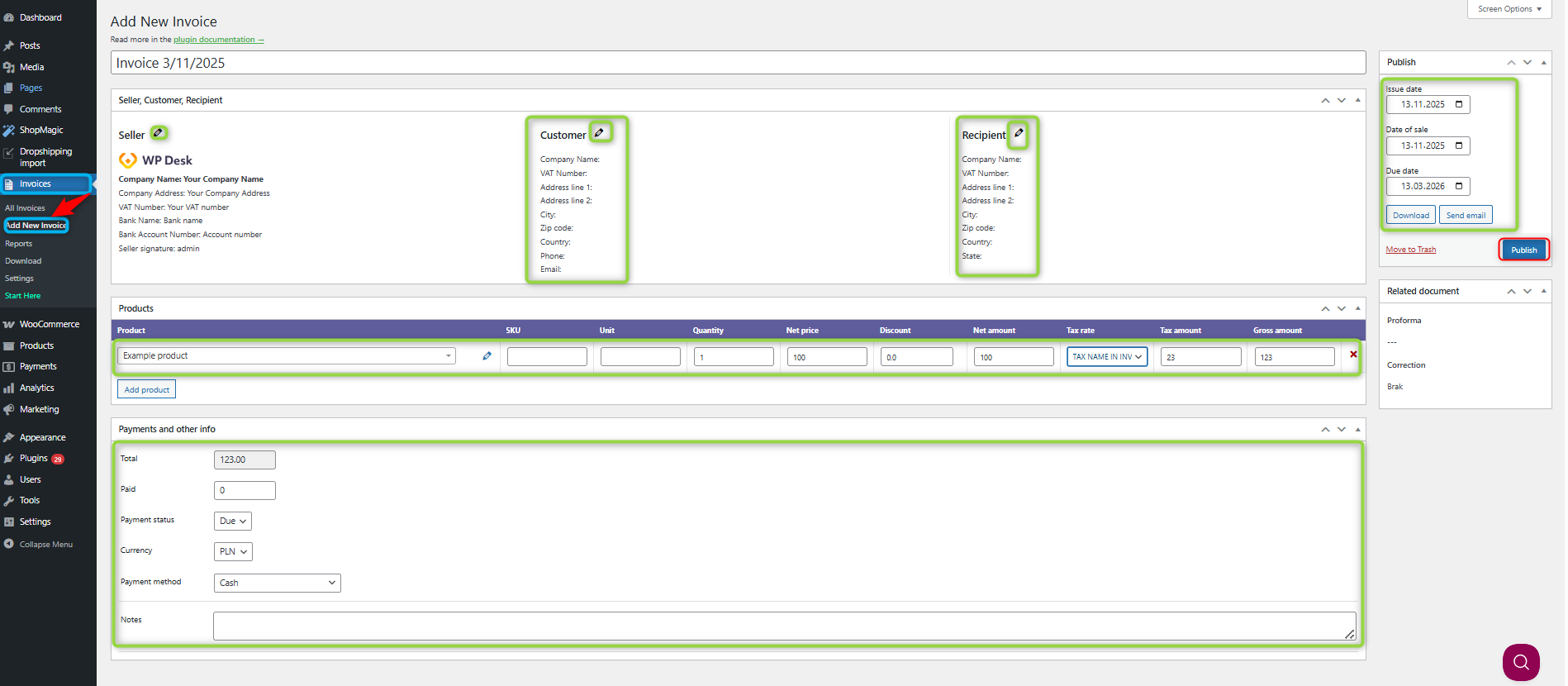 In the Invoices menu, select Add New. Fill out all the fields and products, and then issue the invoice by clicking Publish.